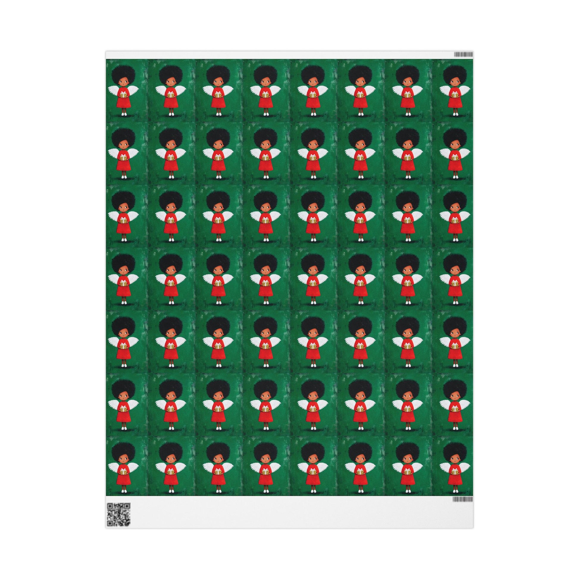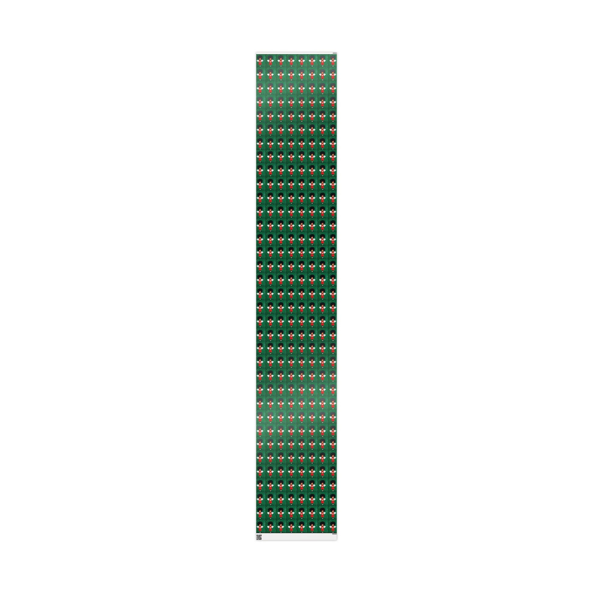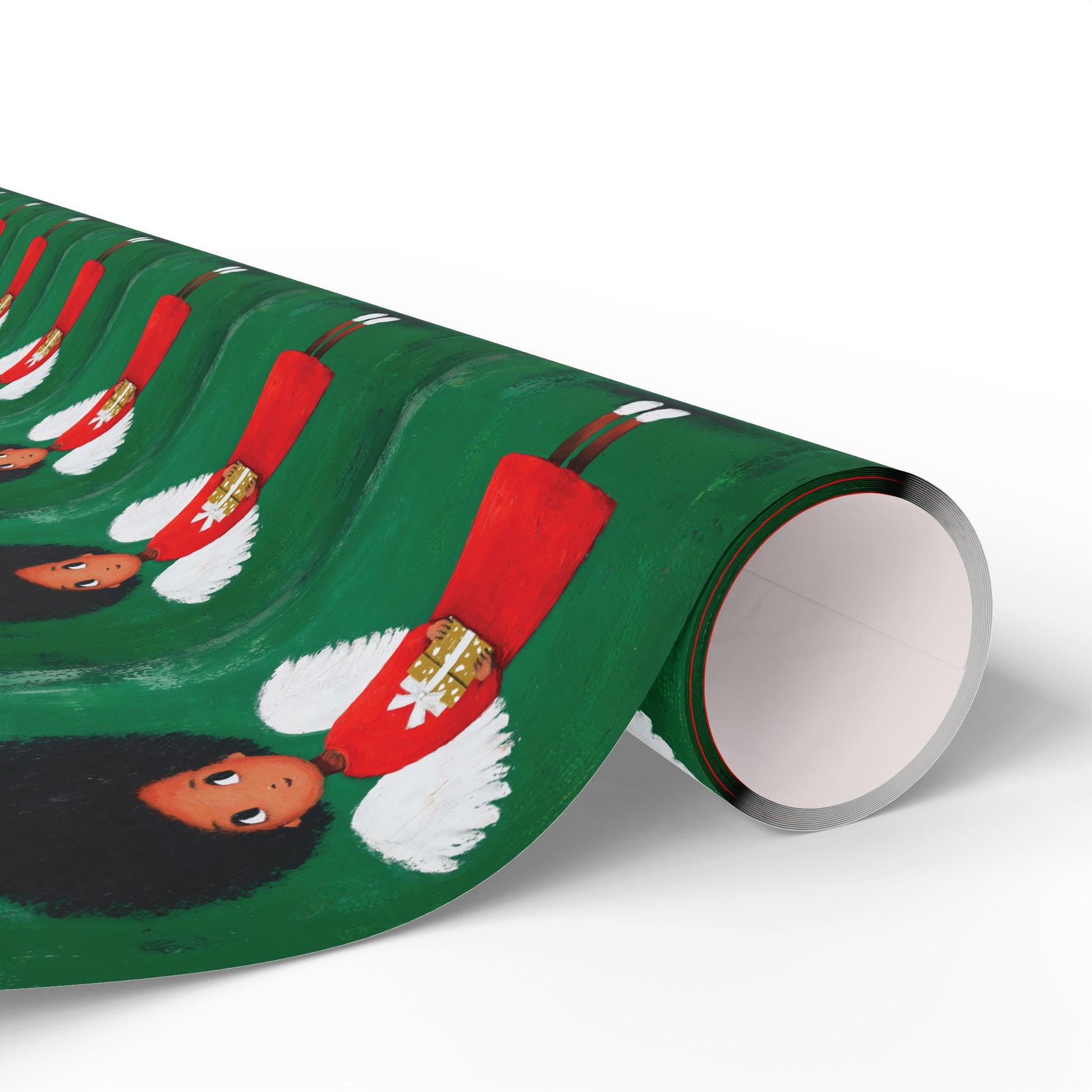 This lush, artful wrapping paper brings a warm, handcrafted touch to holiday moments. The repeat design shows cozy figures against a deep green field, printed in high-definition on sturdy 90gsm fine art paper. Choose glossy for a vibrant, reflective finish or matte for a soft, painterly look. Long narrow sheets work beautifully for taller parcels, bottles, and creative wrapping projects. Small white trim with a barcode and QR code appears at the top and bottom edge as part of the printing process.