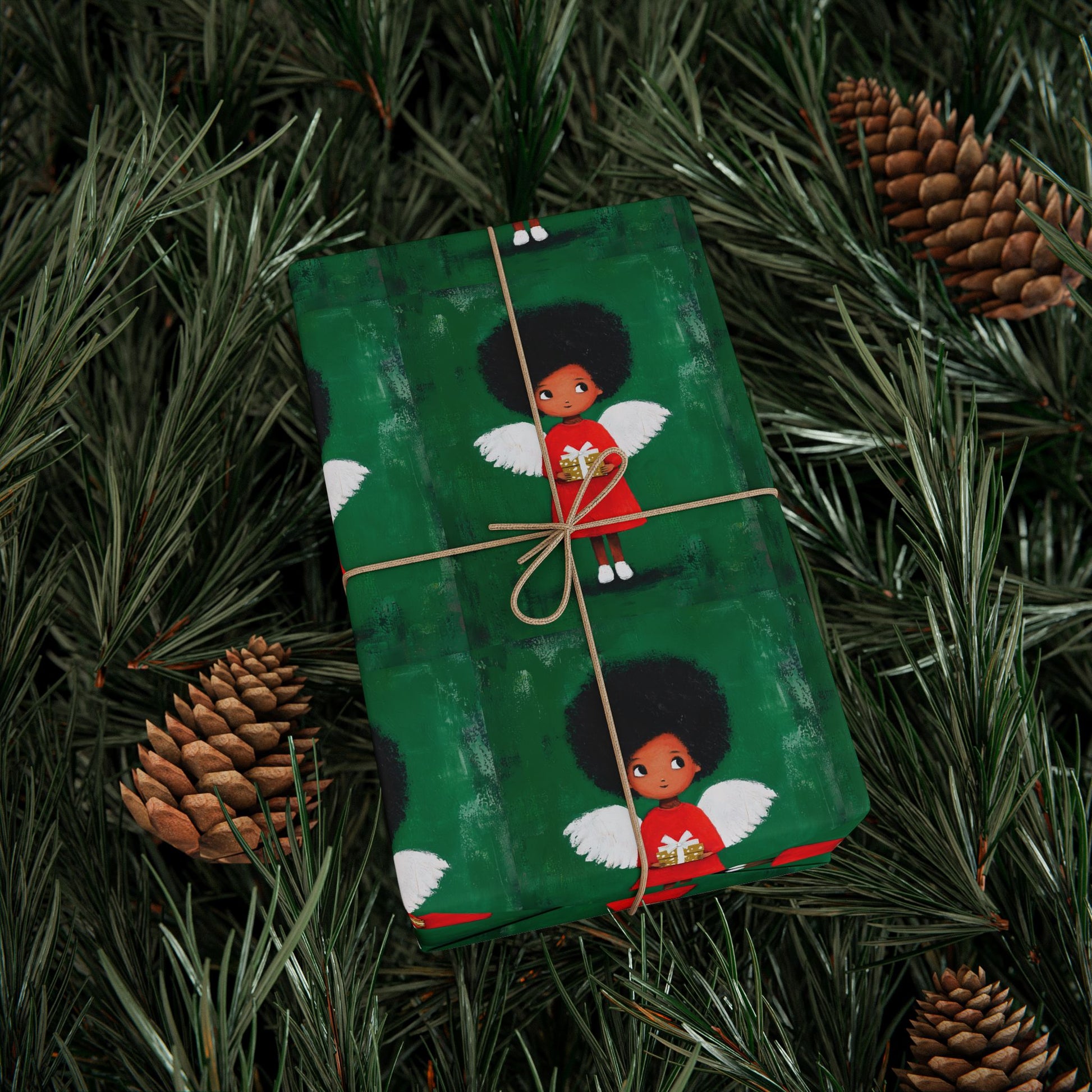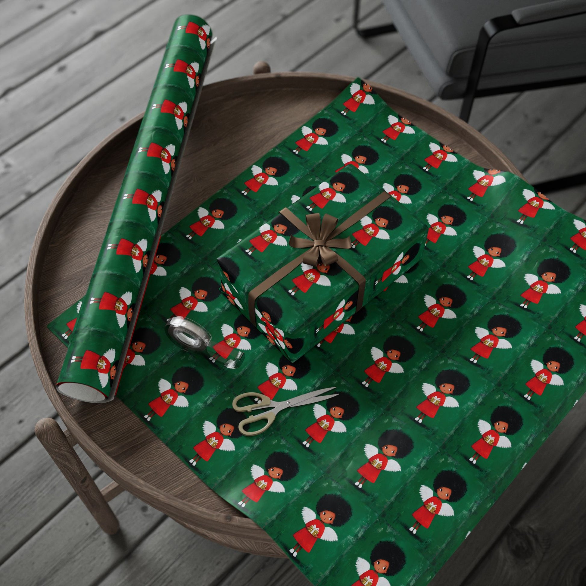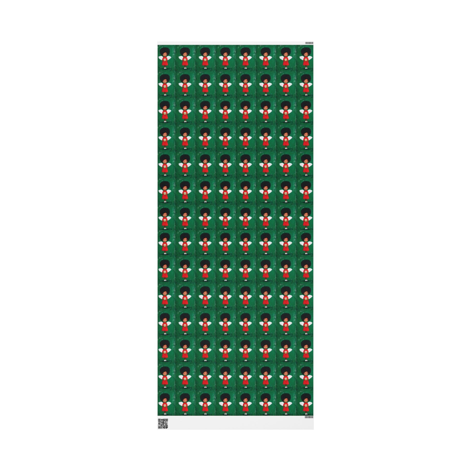 This lush, artful wrapping paper brings a warm, handcrafted touch to holiday moments. The repeat design shows cozy figures against a deep green field, printed in high-definition on sturdy 90gsm fine art paper. Choose glossy for a vibrant, reflective finish or matte for a soft, painterly look. Long narrow sheets work beautifully for taller parcels, bottles, and creative wrapping projects. Small white trim with a barcode and QR code appears at the top and bottom edge as part of the printing process.