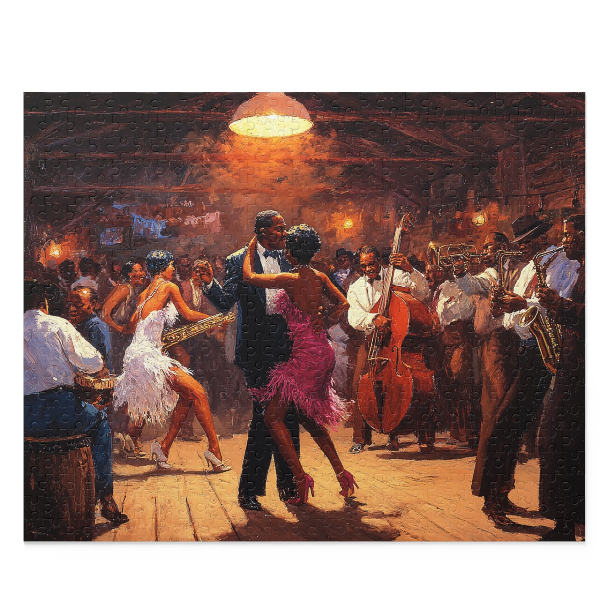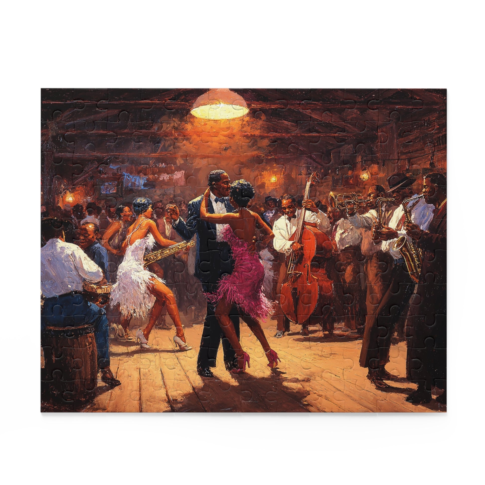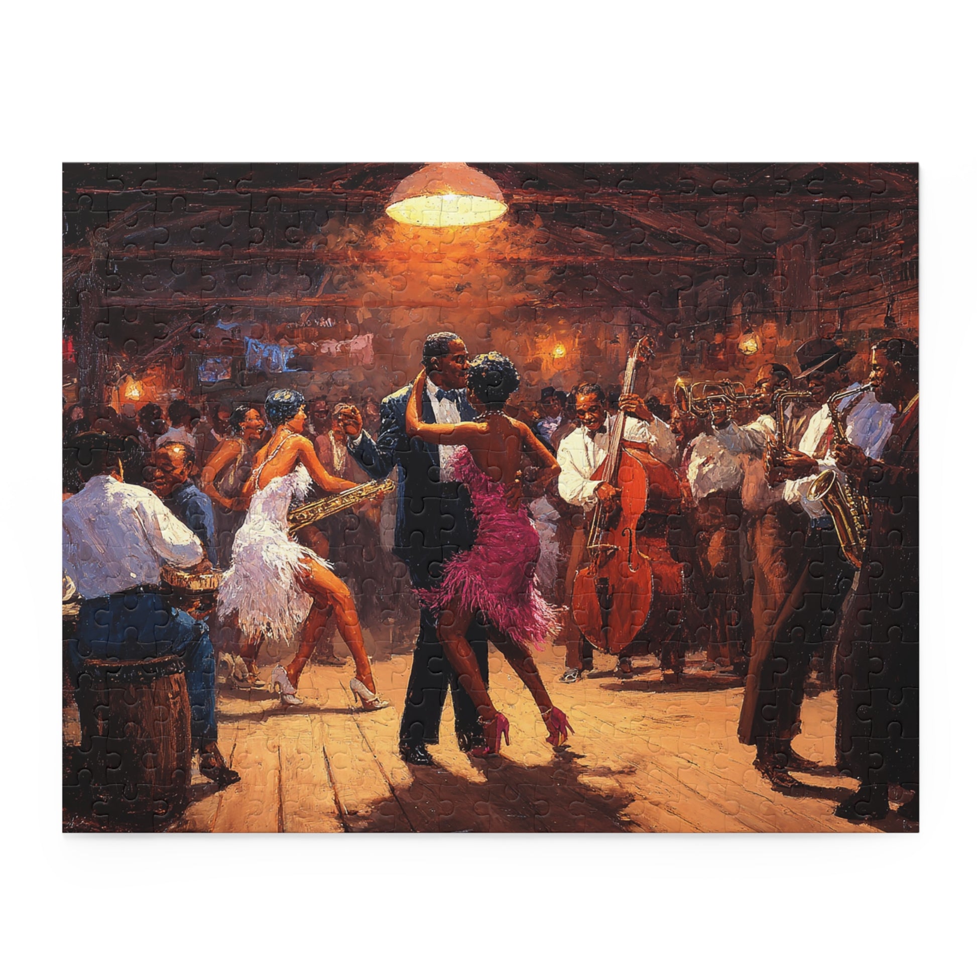 Lose yourself in the warm glow of a bustling jazz hall. The Heartbeat of Jazz puzzle recreates a lively scene of dancers, brass, and upright bass under amber light—each piece bringing you closer to the rhythm and hush of a crowded floor. As you fit the glossy chipboard pieces together, smoky notes and tapping shoes come alive in your living room. It’s a quiet, absorbing way to relive an evening of music with friends or to draw a single afternoon into something cinematic. The finished image sits proudly on the gift-ready box, ready to be displayed or revisited anytime you need a little soundtrack for stillness.