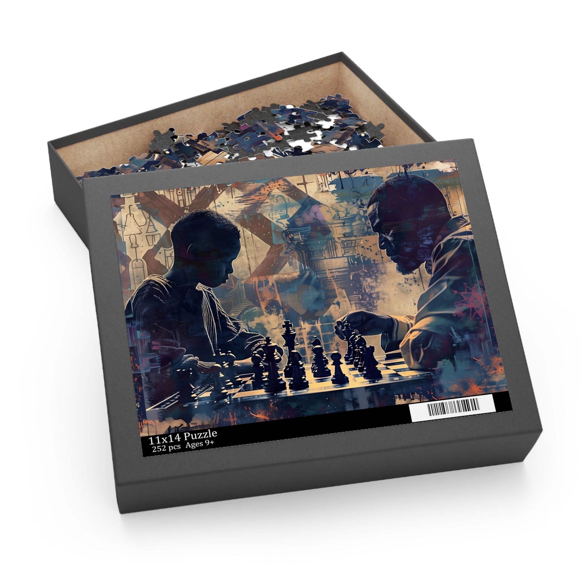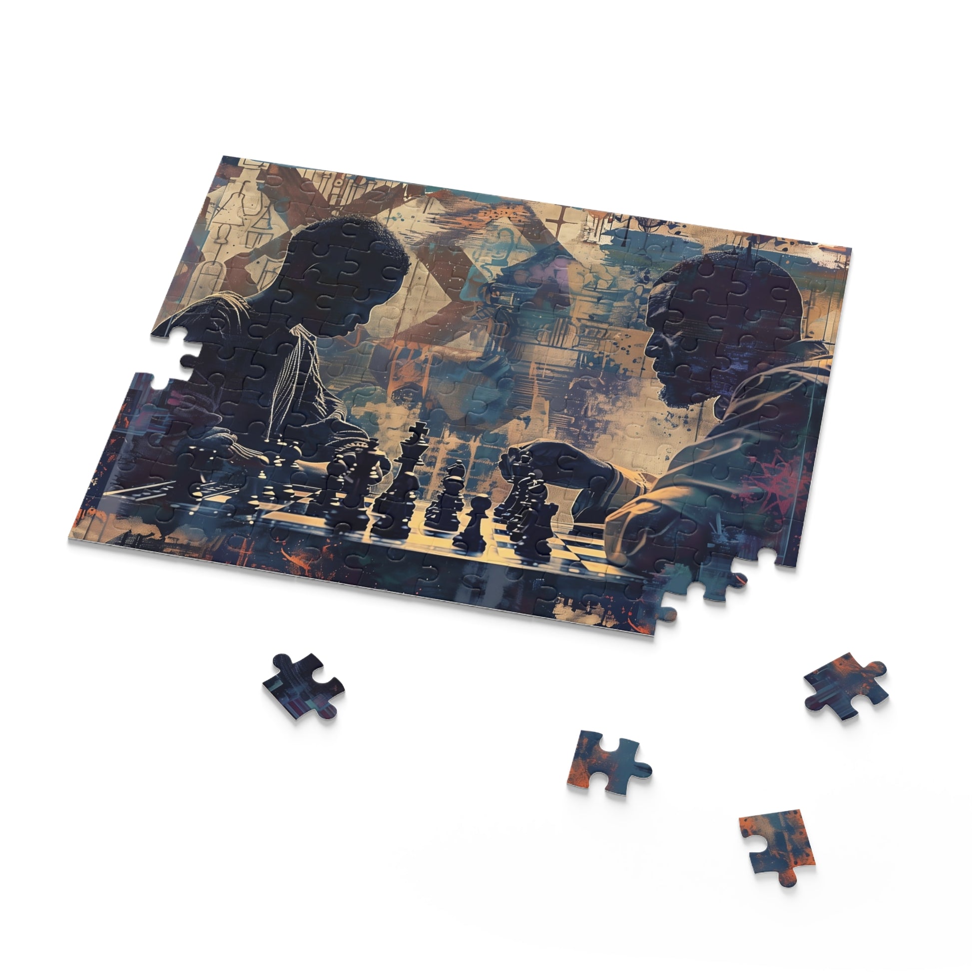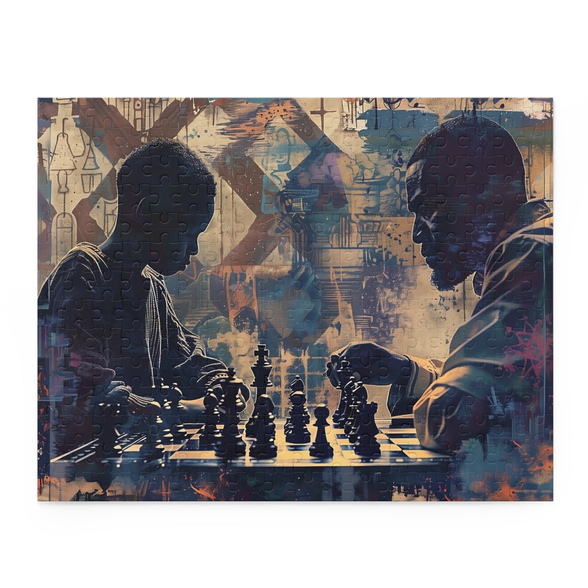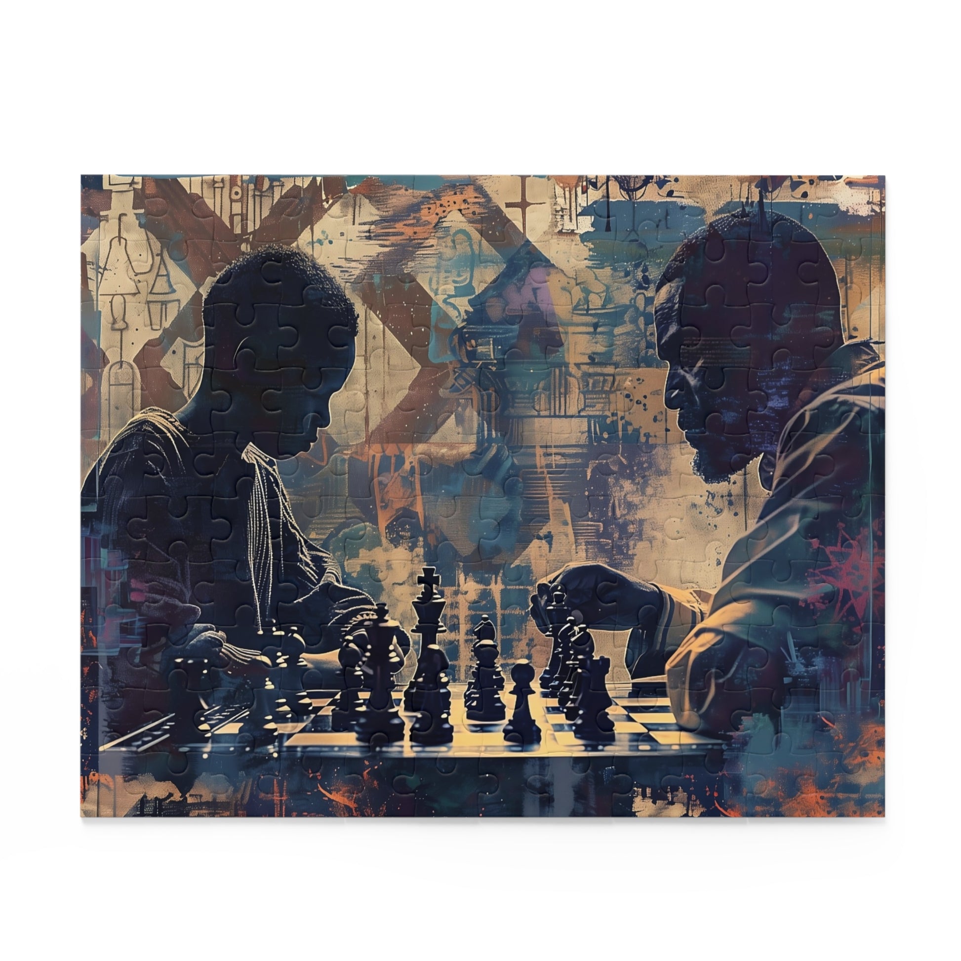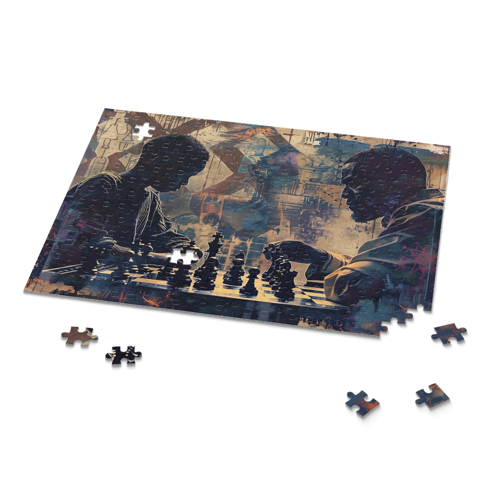 A hand-illustrated puzzle that captures a quiet, focused moment between two players locked in a chess match. Layers of warm and cool tones give the scene depth — the glossy finish brings out subtle color shifts and texture in the artwork. As you fit each chipboard piece into place, the rhythm of the game emerges: concentration, strategy, and shared time. This puzzle invites calm attention and rewards patience, making it a satisfying way to unwind or connect over a tabletop challenge. The finished image is printed on the box so you always have the reference while you work.